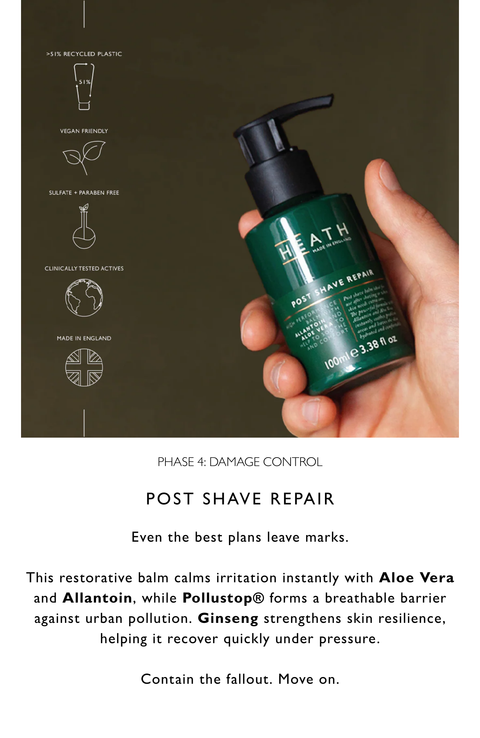 Post Shave Repair 100ml | The powerful formula with Allantoin and Aloe Vera instantly soothes problem areas and leaves the skin hydrated and comfortable.